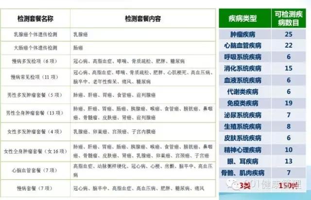 解放军总医院健康管理研究院开展疾病易感基因检测,通过对肿瘤、心脑血管疾病、代谢性疾病、消化系统疾病、呼吸系统疾病、自身免疫性疾病等13大类150种(男性64项、女性67项)慢性疾病易感基因进行检测,对患病风险进行评估和预警,并制定精准的个性化健康管理方案,指导疾病预防和治疗。
